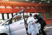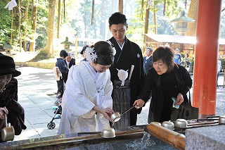 ホテルからマイクロバスをご手配させていただき、総人数22名様での挙式でした。鹿島神宮に到着後手水の儀をすまされいよいよ境内へとお進み頂いた二人。