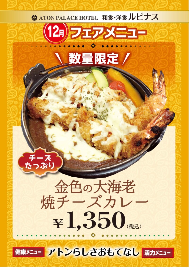 毎月恒例!ルピナス店の限定フェアメニューですが、12月は【金色の大海老焼カレー】をご提供中です。