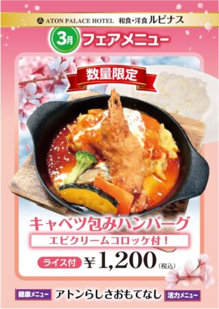 毎月恒例!ルピナス店の限定フェアメニューですが、3月は【キャベツ包みハンバーグ】をご提供中です。