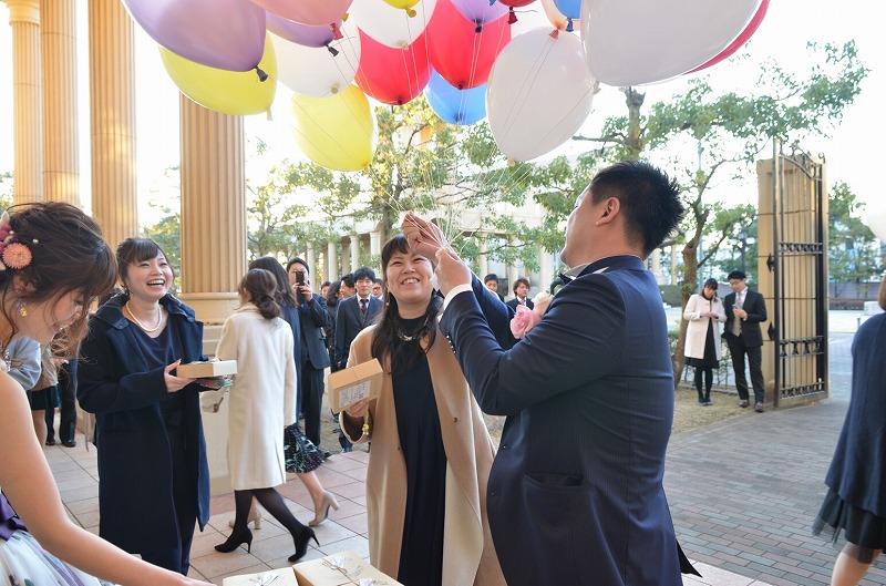 最後はゲストの花道で退場しました。おめでとうございました。最後にゲストと一緒にガーデンでバルーンリリースです。とても素敵なweddingのご紹介です!