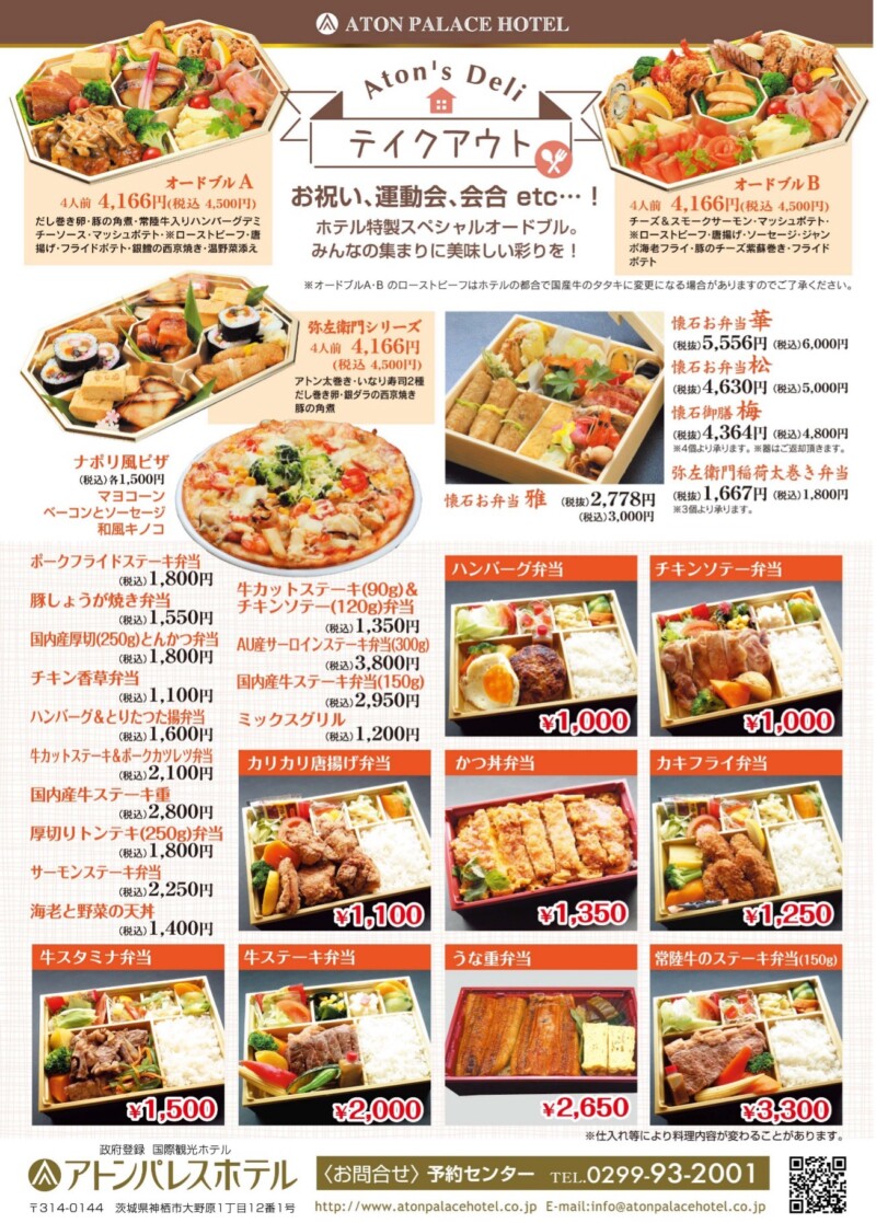 メニュー:だし巻き卵・豚の角煮・常陸牛入りハンバーグデミチーズ・マッシュポテト・ポークステーキ・唐揚げ・フライドポテト・銀鱈の西京焼き・温野菜添え
